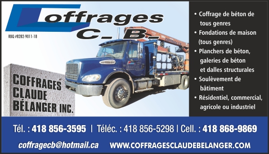 Quels que soient vos projets ou besoins en terme de produits et services, vous trouverez en COFFRAGES CLAUDE BÉLANGER 9112-3745 QUÉBEC INC un partenaire de confiance reconnu pour son approche professionnelle et son efficacité. Nous sommes des experts en Coffrages - Coffreurs, .